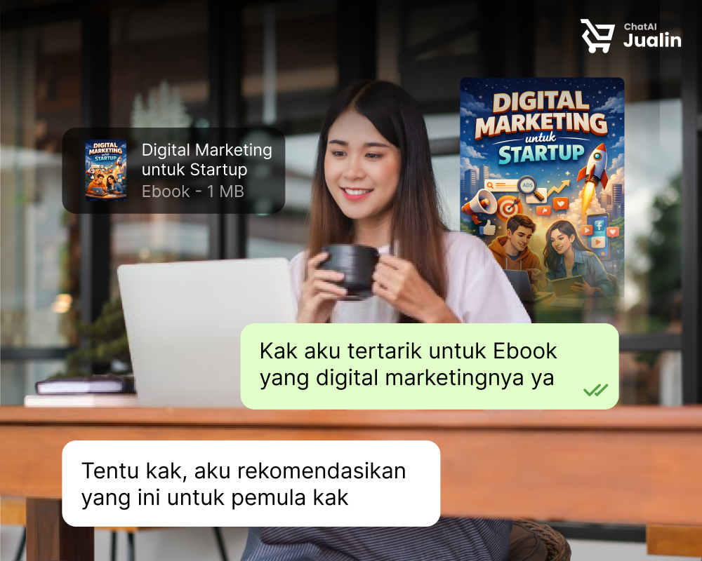 Untuk produk digital seperti ebook, kelas online, atau layanan berlangganan, Jualin membantu menjawab pertanyaan, memandu pembelian, dan mencatat transaksi dengan rapi.